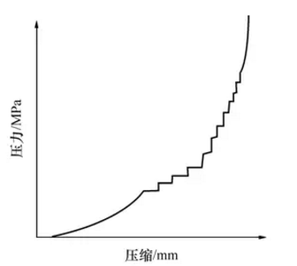 在這個(gè)階段中,耐火磚成型壓力已增加到能使泥料內(nèi)顆粒發(fā)生脆性和彈性變形的程度,所以在壓制時(shí)由于泥料內(nèi)顆粒受壓變形和多角型顆粒的棱角被壓掉,從而使坯體內(nèi)顆粒間的接觸面增加,摩擦阻力增大。因此,使這一階段的壓制特性表現(xiàn)為跳躍式的壓縮變化,即呈階梯形變化曲線;當(dāng)壓制進(jìn)入第三階段時(shí),成型壓力已超過臨界壓力,即使壓力再升高,坯體幾乎不再被壓縮。下圖的這種耐火磚對模具的要求和壓力機(jī)的選擇都要求很高。